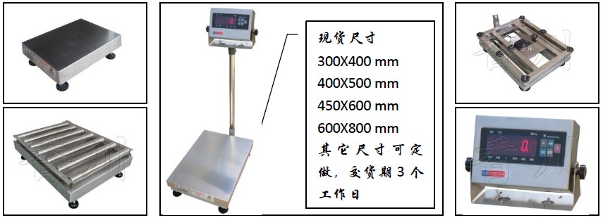 稱重儀表: LEF數碼顯示,清晰易讀, 內置可充蓄電池,交直流兩用 304不銹鋼材質,抗干擾能力出色 具歸零、扣重、累加、單位轉換等功能 多臺面尺寸,量程從30kg到1000kg可選 可充電電池供電,充電一次可連續使用90小時