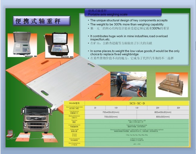 9.上海香川衡器有限公司生產的便攜式軸重秤使用場所,固定式汽車衡環境不允許之情況,經常移動稱重環境,公路超載檢查,工廠出貨自行把關,礦山礦石原材,工地黃沙水泥等附加值不高產品稱重計量,便攜式汽車磅是你理想的選擇。